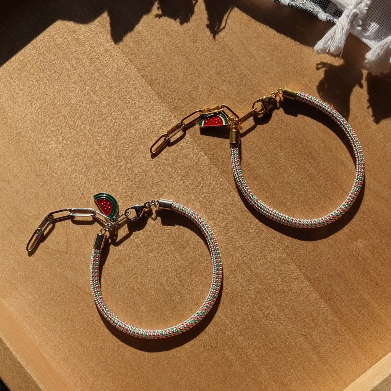 ペーパークリップチェーンのアジャスターと、スイカのチャームがアクセントに。