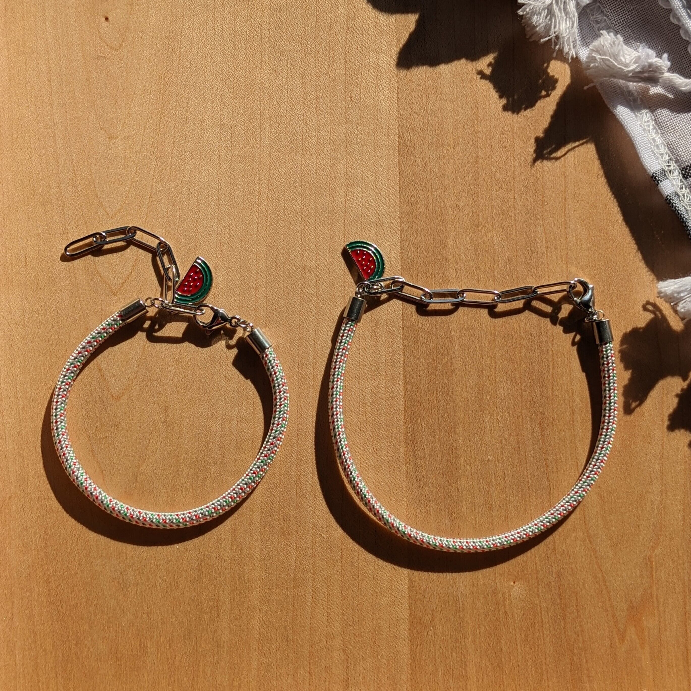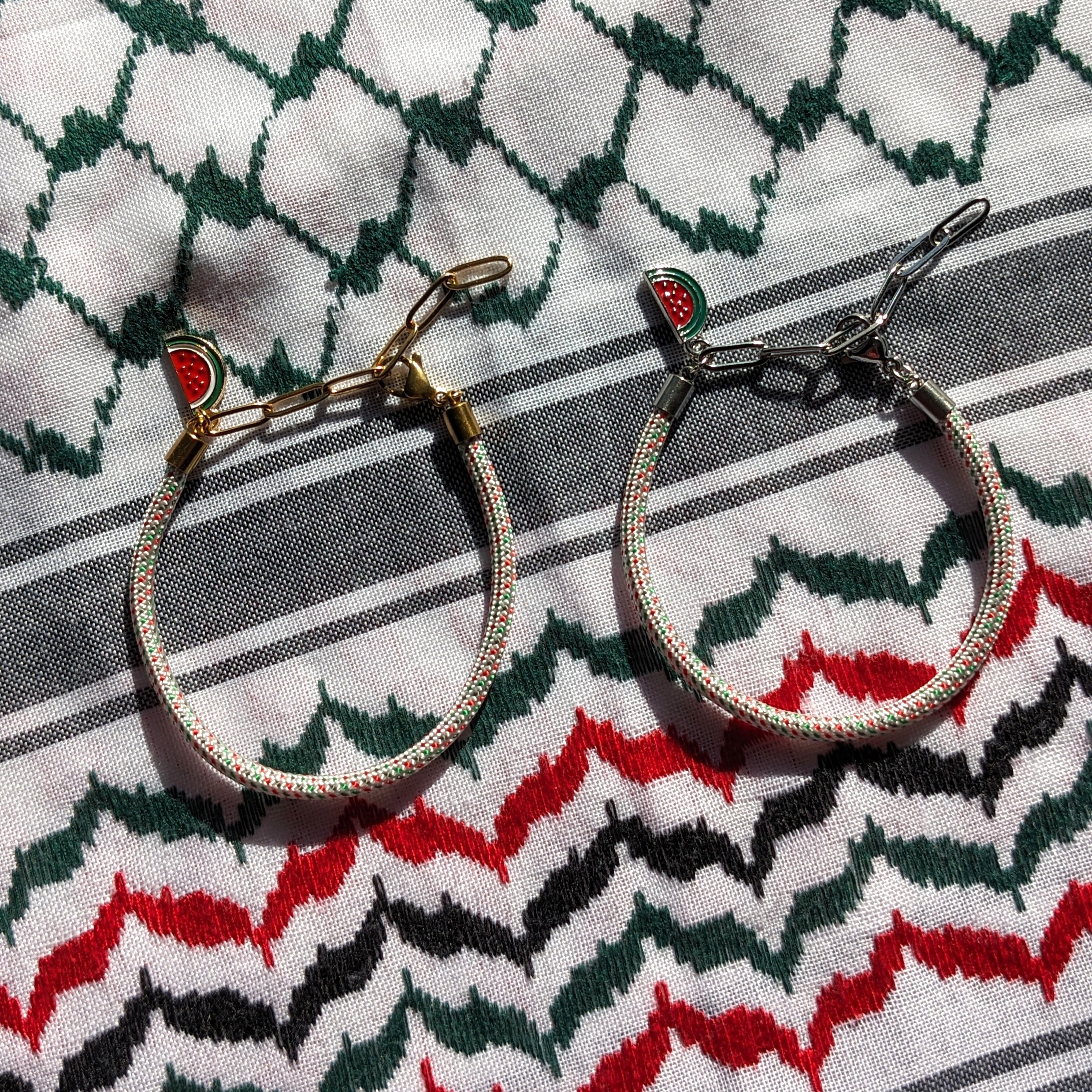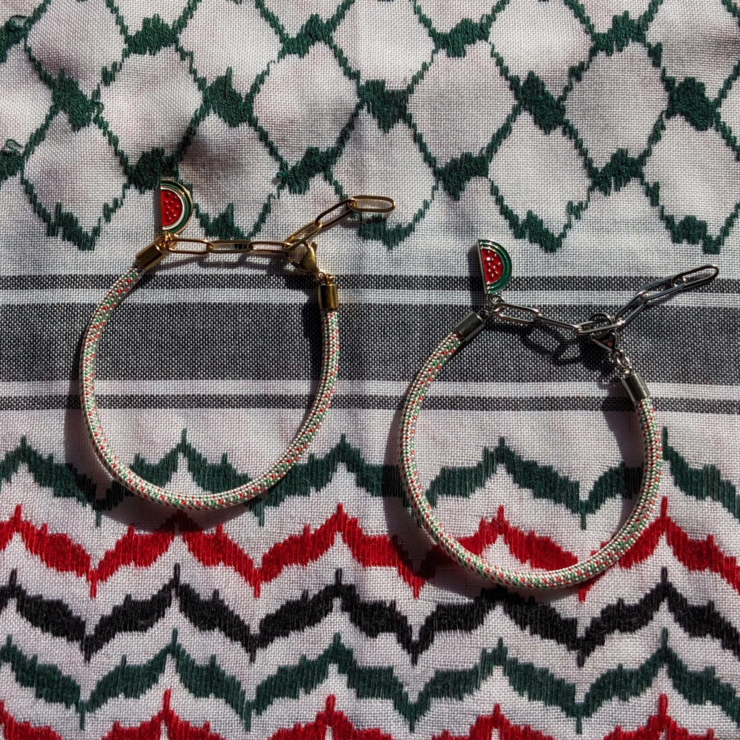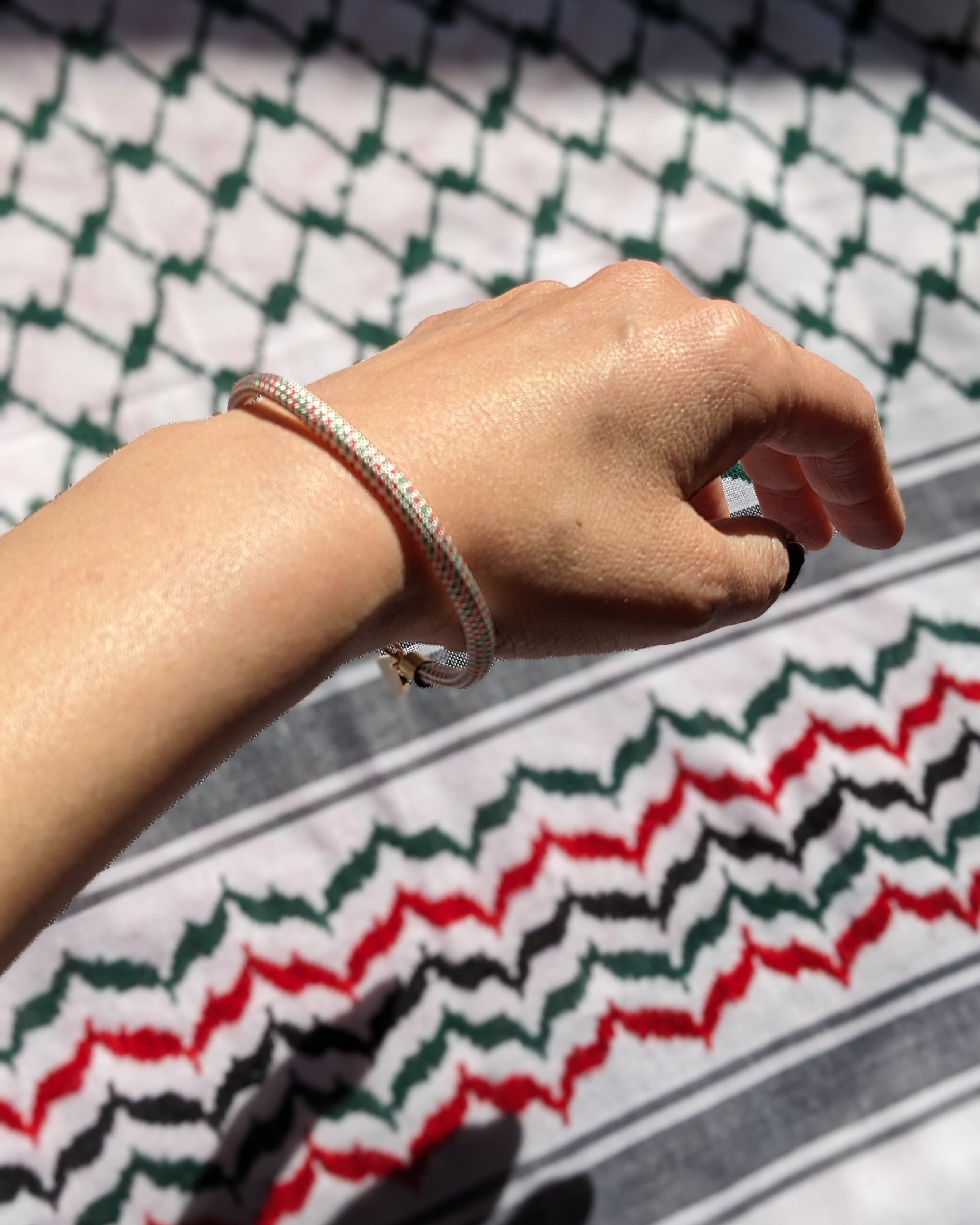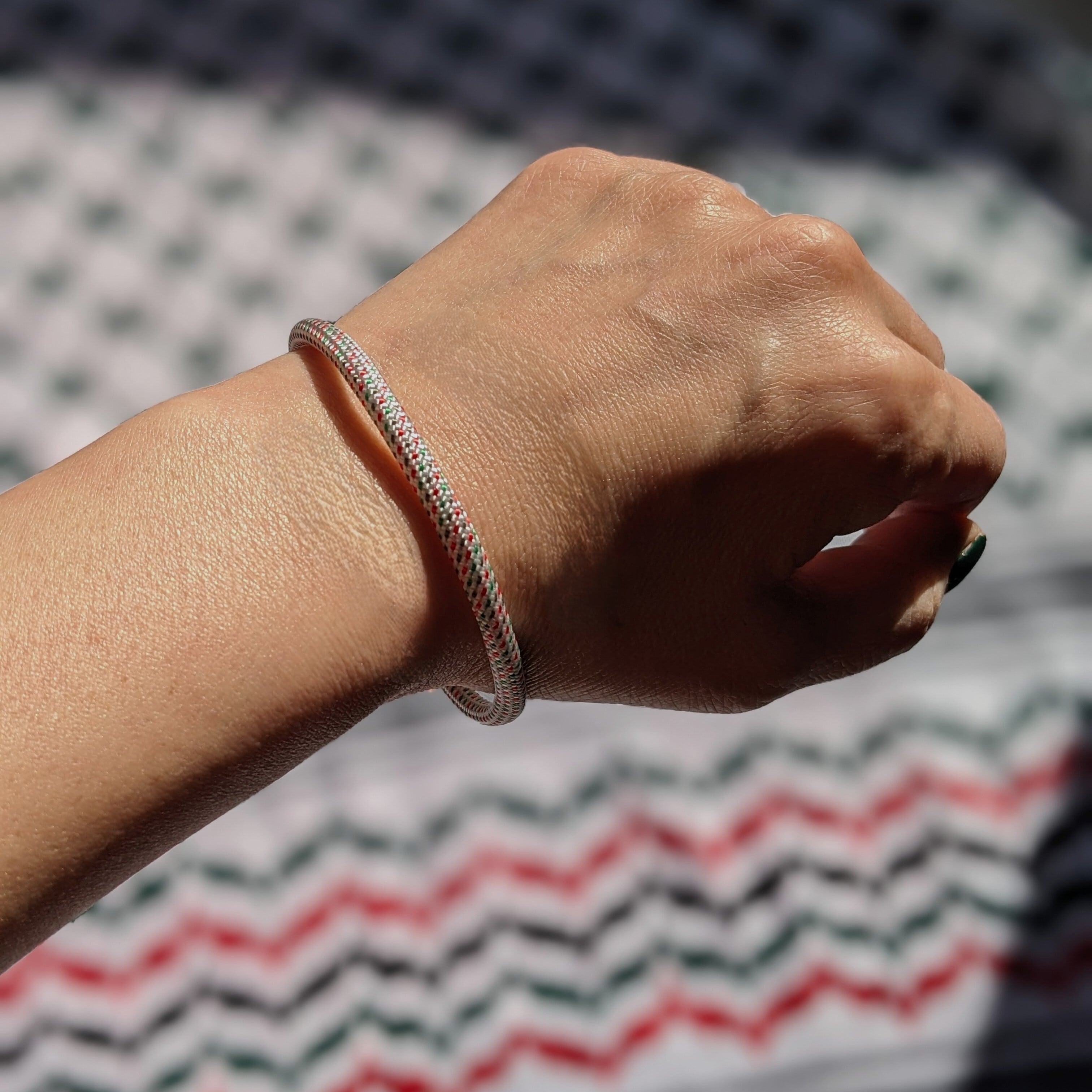 パレスチナ国旗カラー(赤・緑・白・スミクロ)に見立てた、ドット柄のナイロン製パラコードで、ブレスレットを作りました。