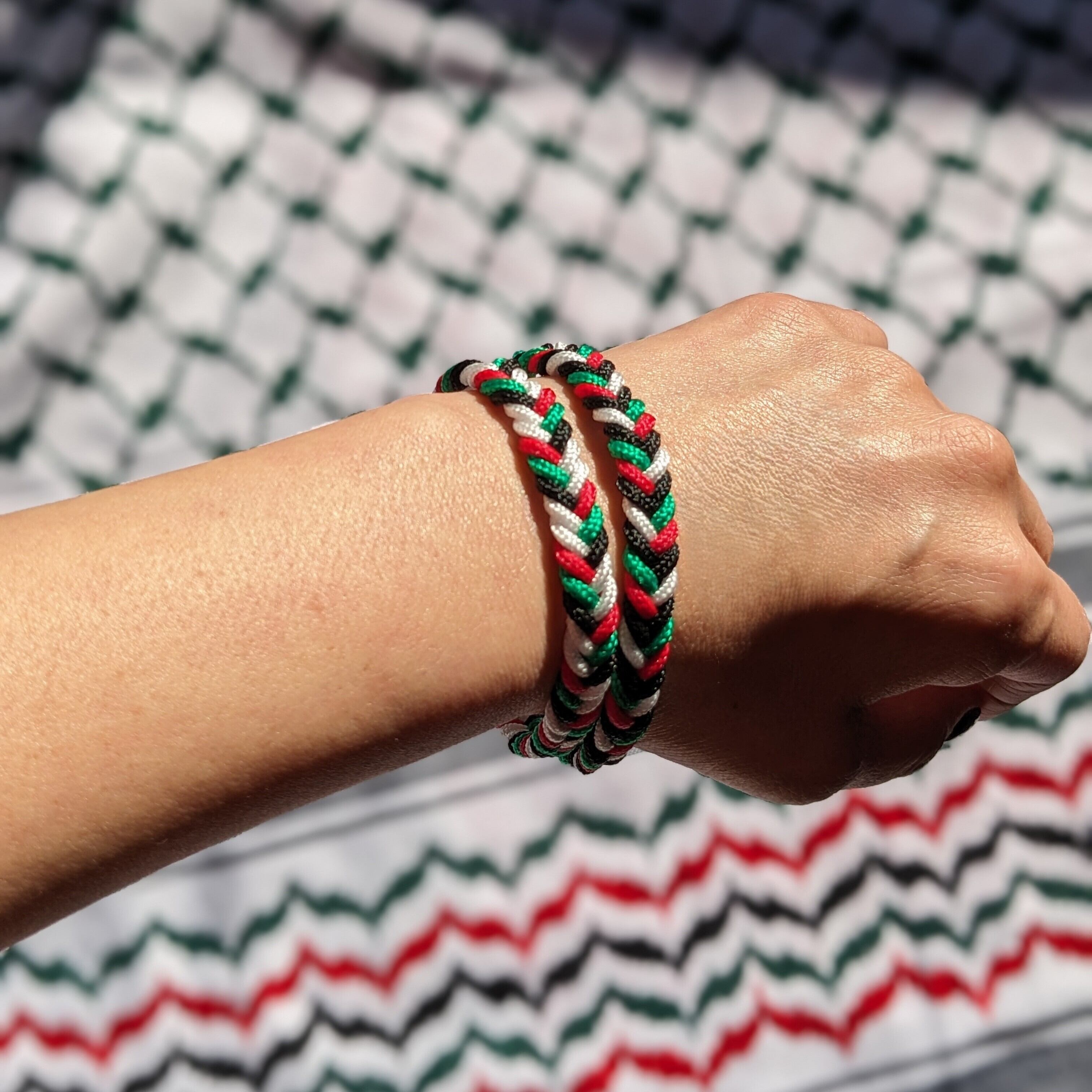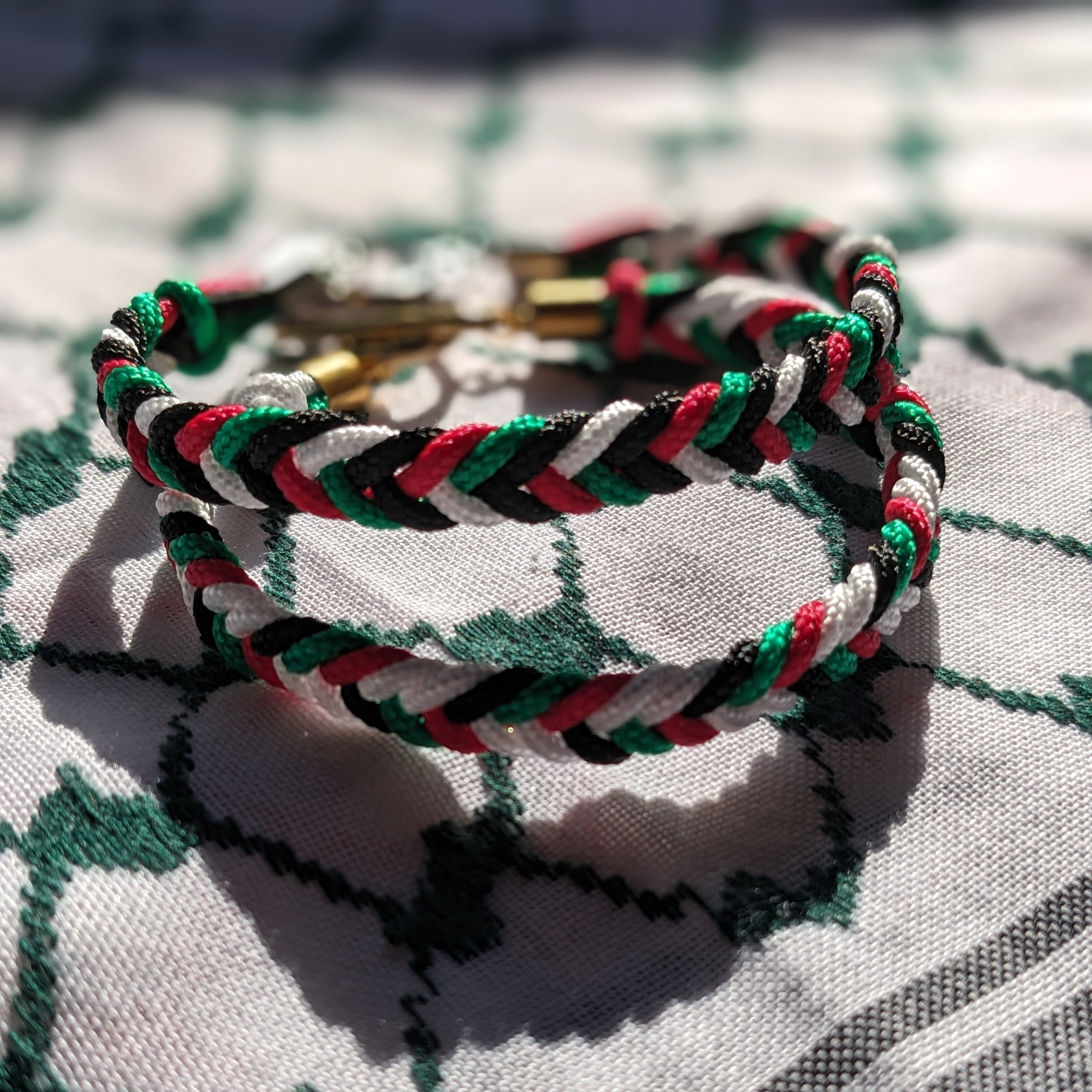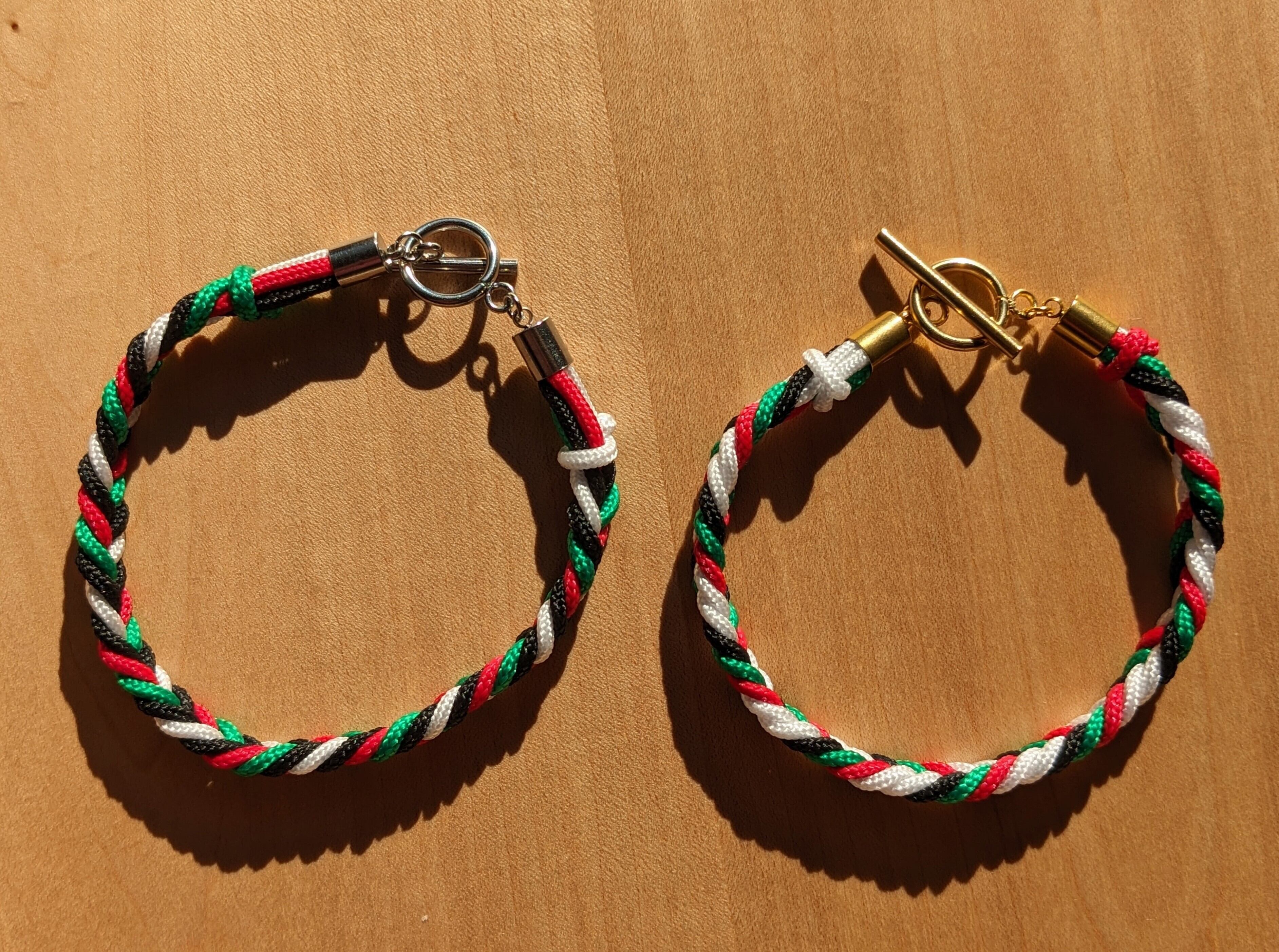 パレスチナ国旗カラーのコードで編んだブレスレット。