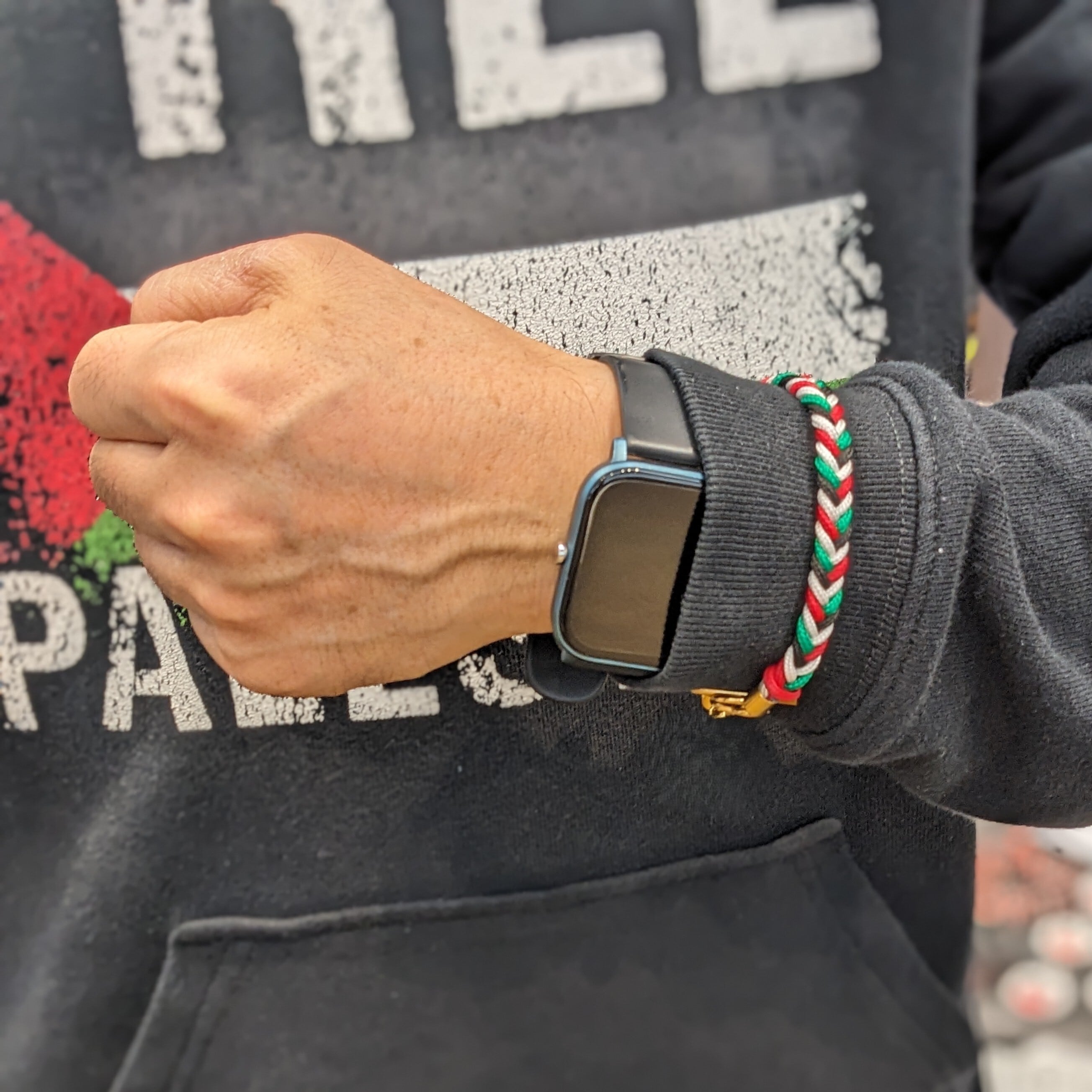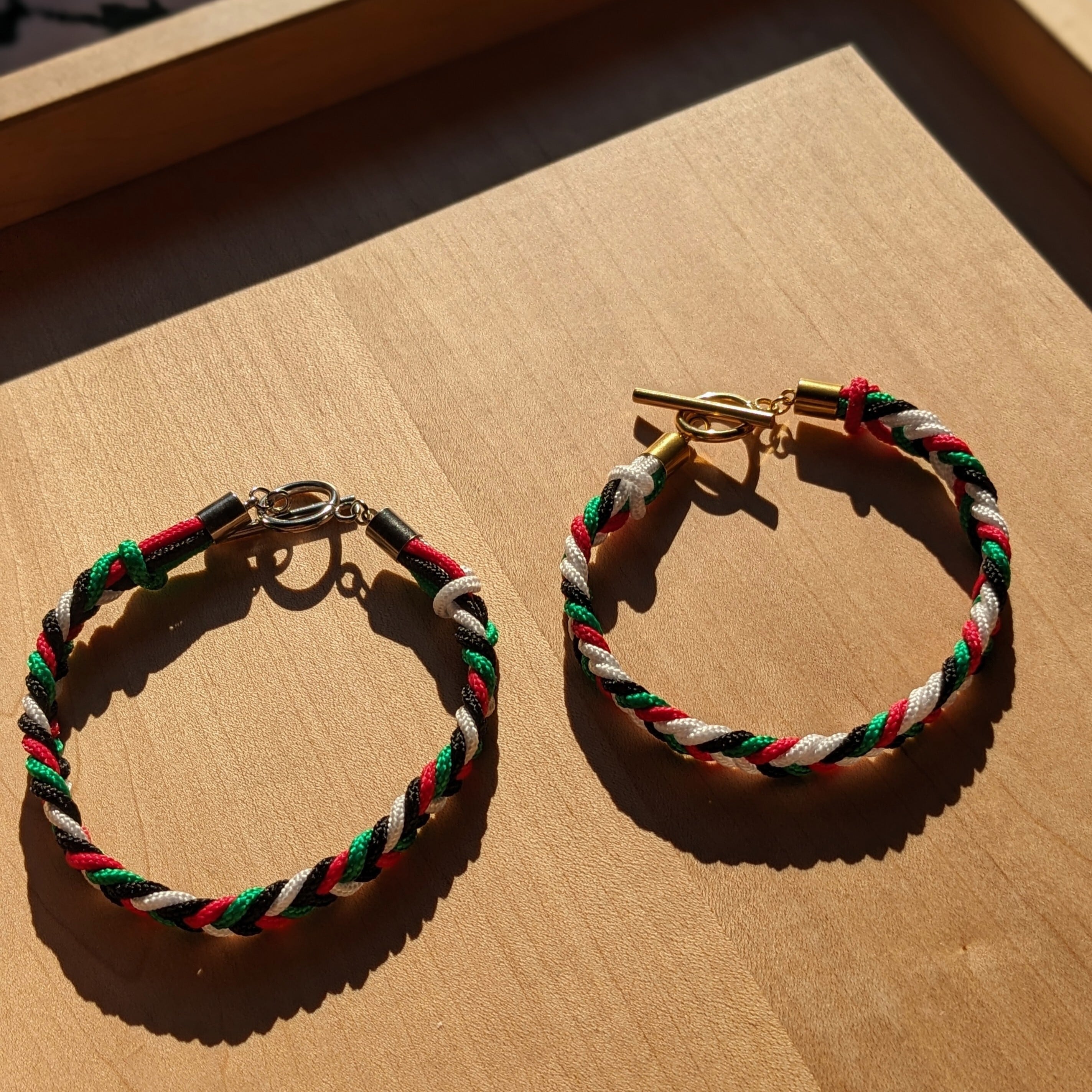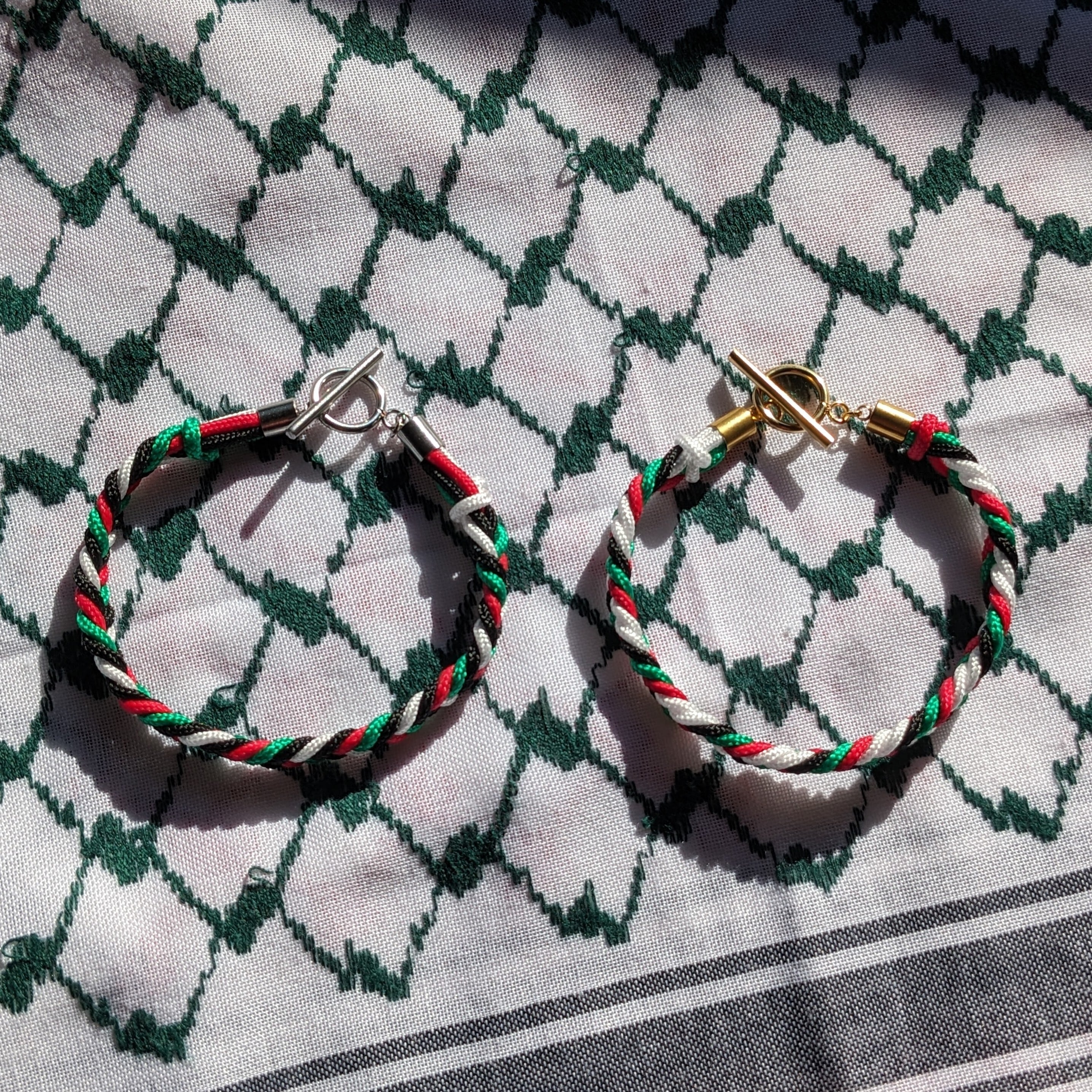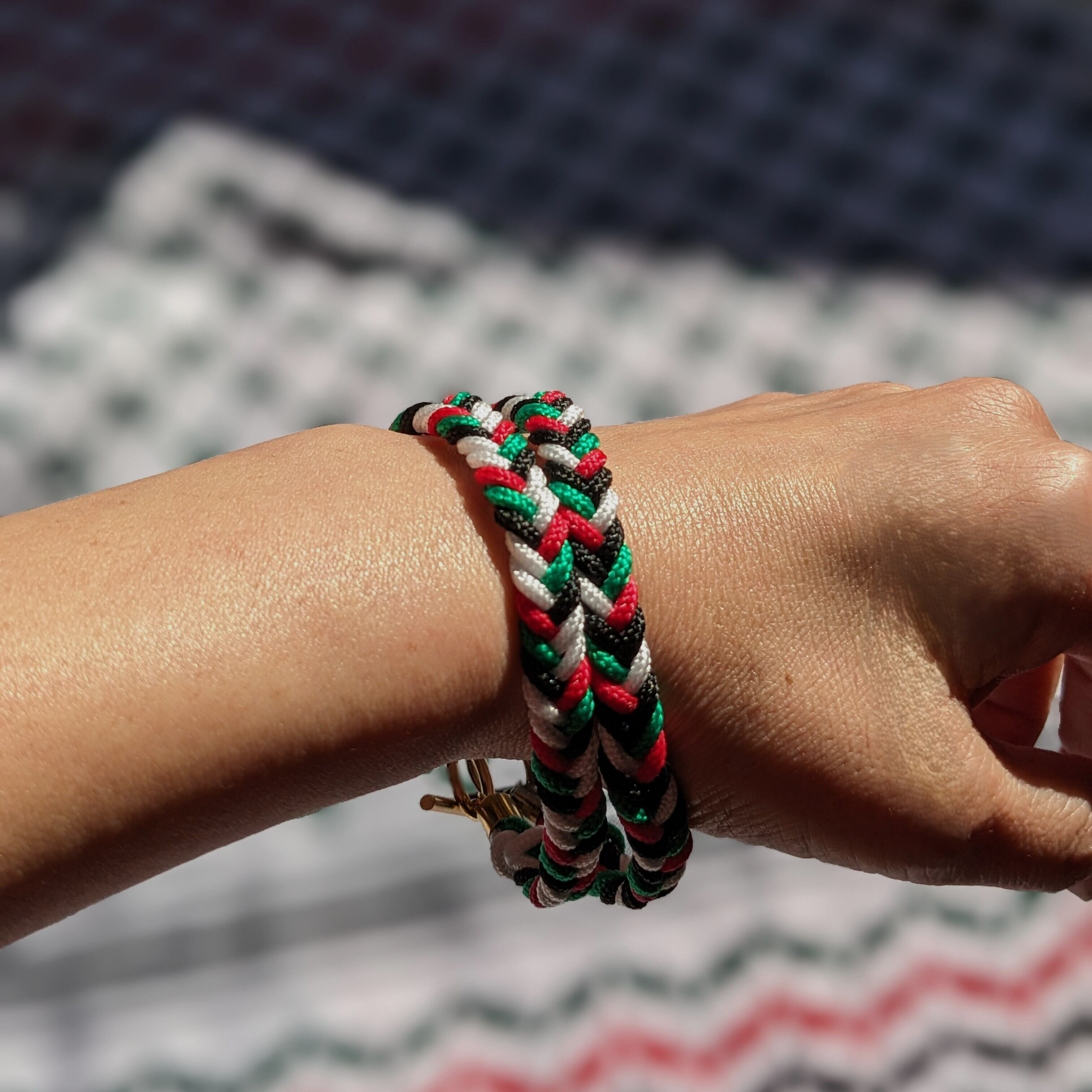 パレスチナ国旗カラーのコードで編んだブレスレット。