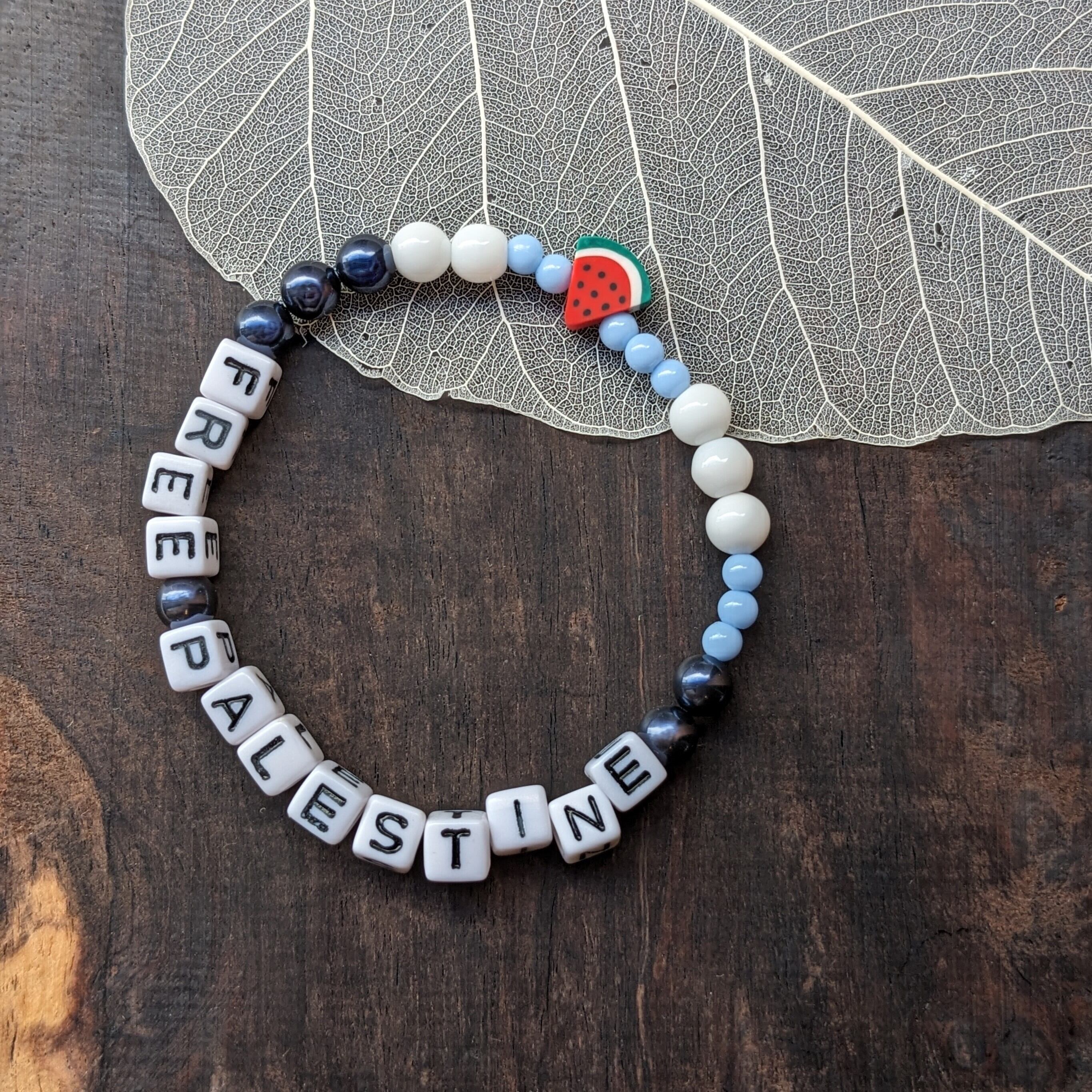 「FREE PALESTINE」のメッセージアルファベットビーズと、