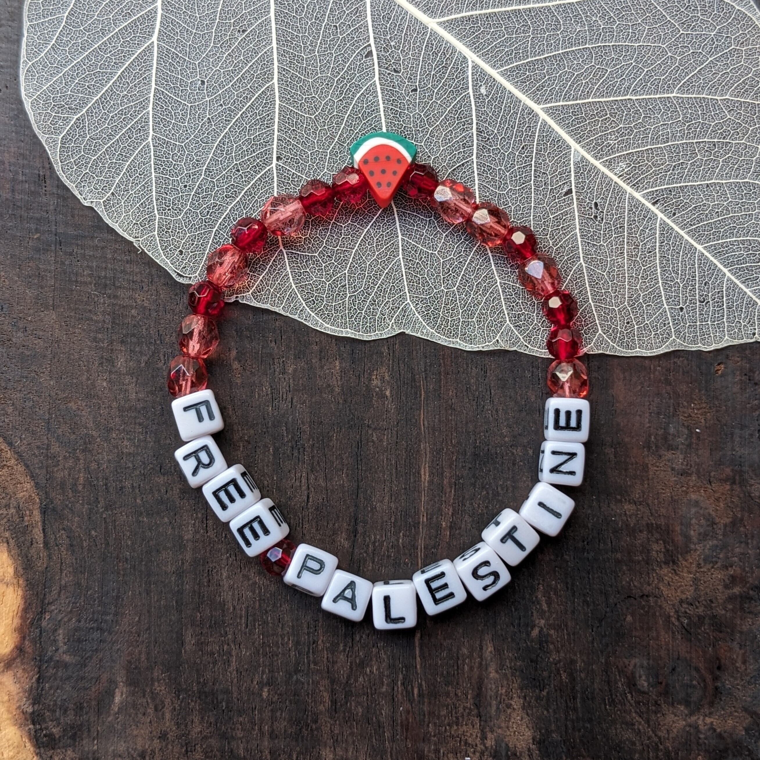 「FREE PALESTINE」のメッセージアルファベットビーズと、